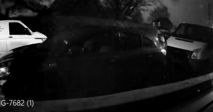 CCTV footage revealed two men cheating on death when a giant tree fell on a car while they were unloading it from a shopping spree.
